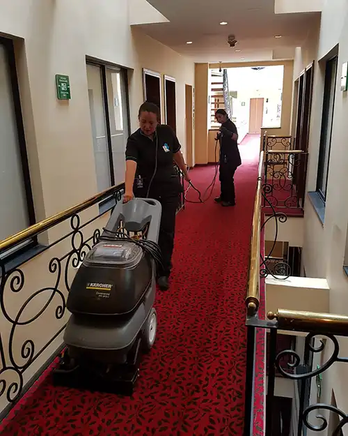 - Lavado e higienización de alfombras con equipos de inyección–succión y secado rápido.