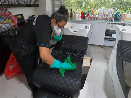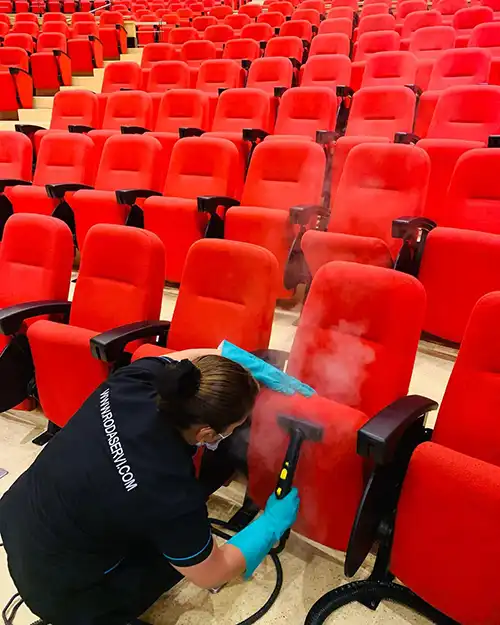 - Lavado de silletería: desmanchado profundo, control de olores y cuidado de cada material (sillas, sofás, auditorios, cines).